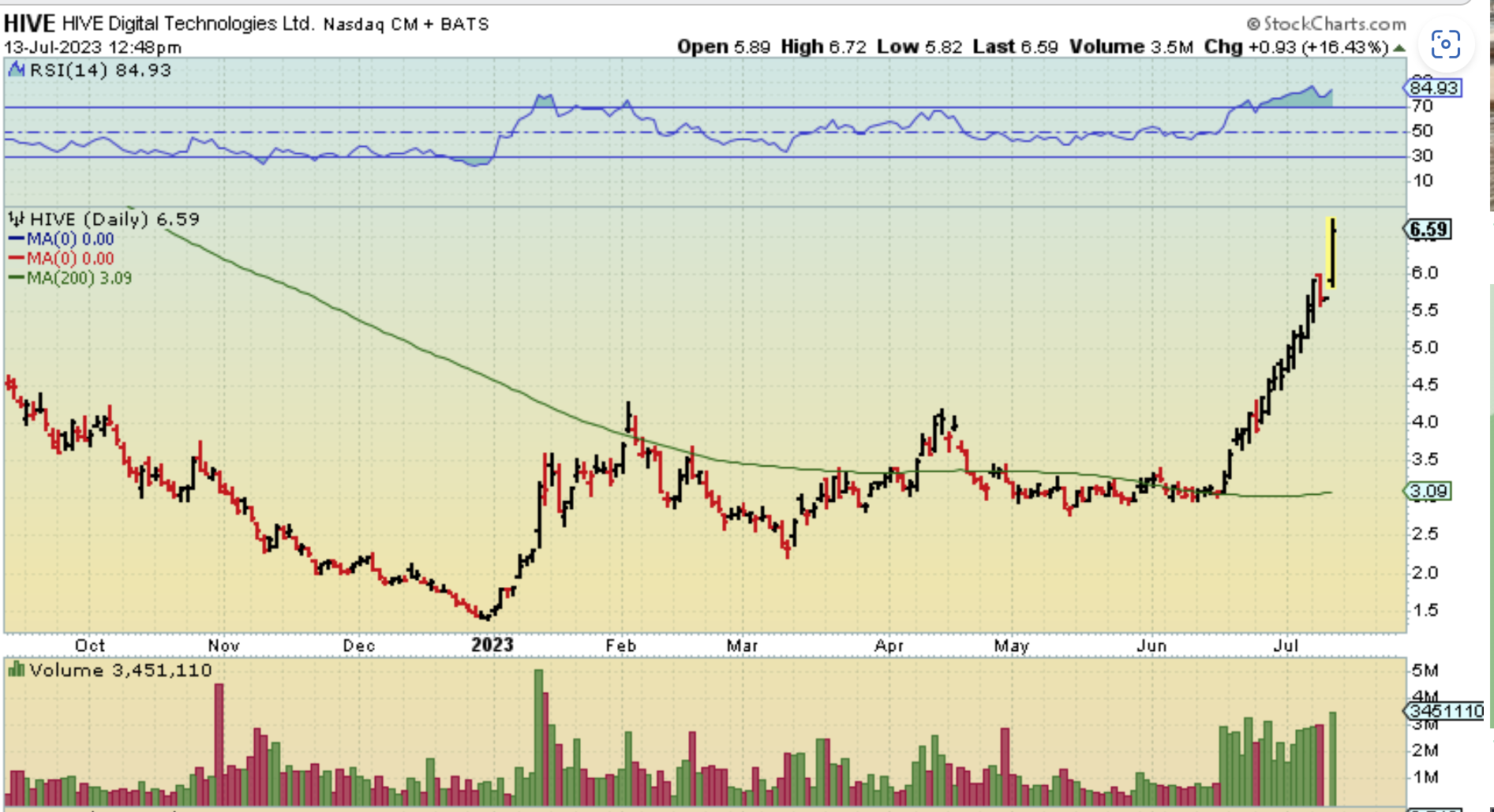 HIVE– After the long consolidation at the 200sma, it has ripped higher, over 100%.