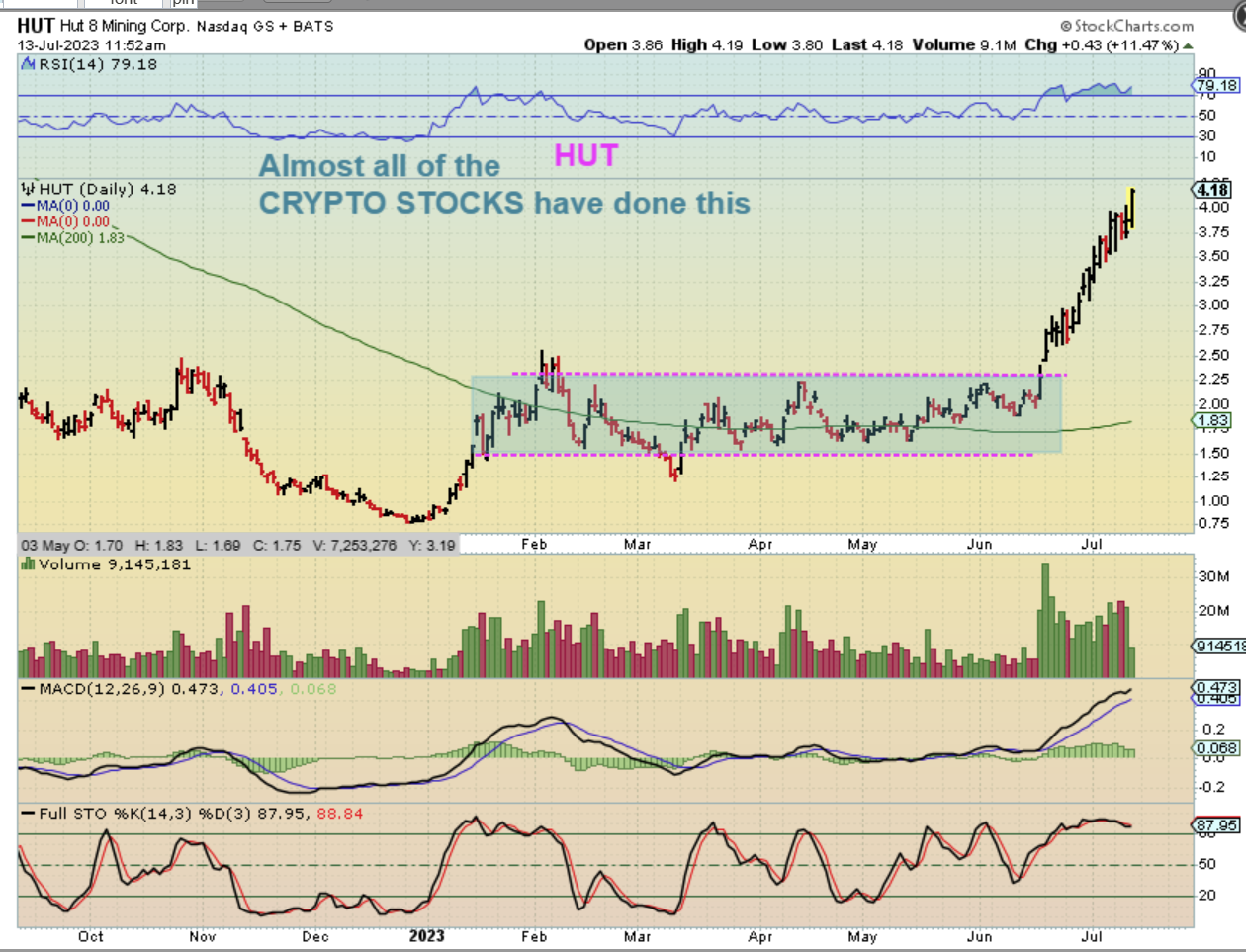 HUT -Another move of over 100% off of that 200sma. Many of the Crypto stock have done this and we’ve made great gains here.