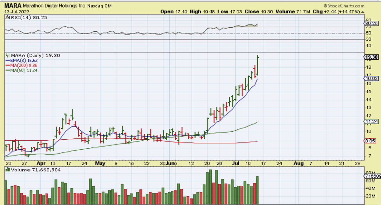MARA – If you look at the 8 ema ( or 9 sma), I mentioned that this is one way that you can play a ‘running correction’.  You allow it to take you out of the trade rather than sell, however a gap down & sharp sell off can take the entire last days gains away before you know it. You still would have great gains though.
