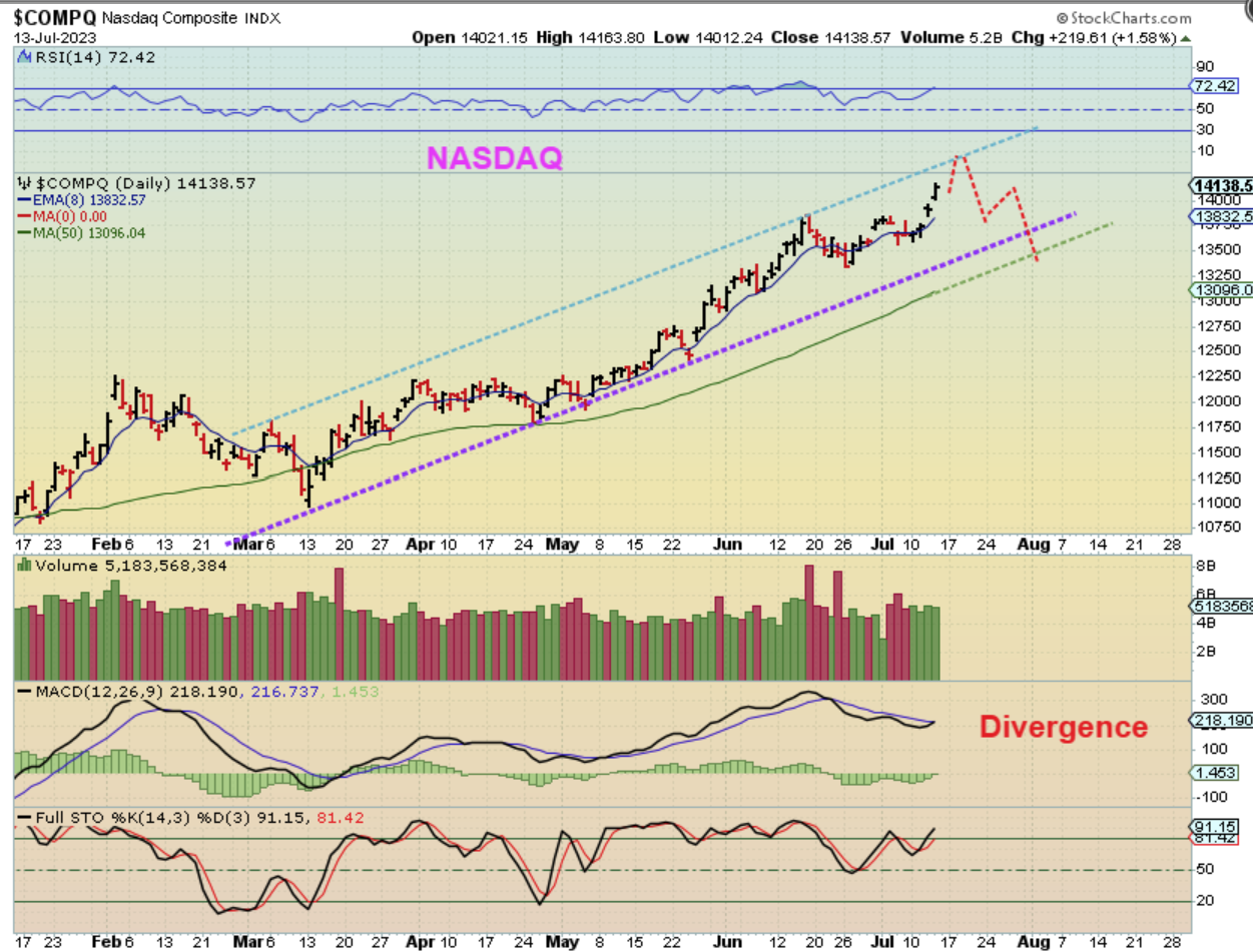 NASDAQ – The wedge with divergence has broken to the upside, and tht now gives a new peak on day 12.