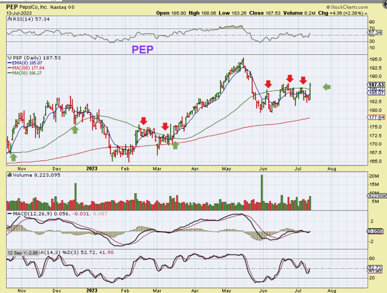 PEP delivered earnings and is breaking out above the 50sma. Sespite inflation, they showed that revenue and adjusted earnings per share soared by double-digit percentages.