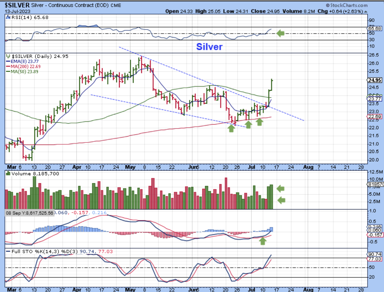 SILVER does not know how to hide its feelings about the USD failure  🙂 Silver broke the wedge or downtrend line 2 days ago when the USD failed, and it has been strong since then.  Silver sliced right through the 50sma.  Did you notice that Silver Stocks paused yesterday with Gold? I think that they may play ‘Catch Up’ to Silver soon.