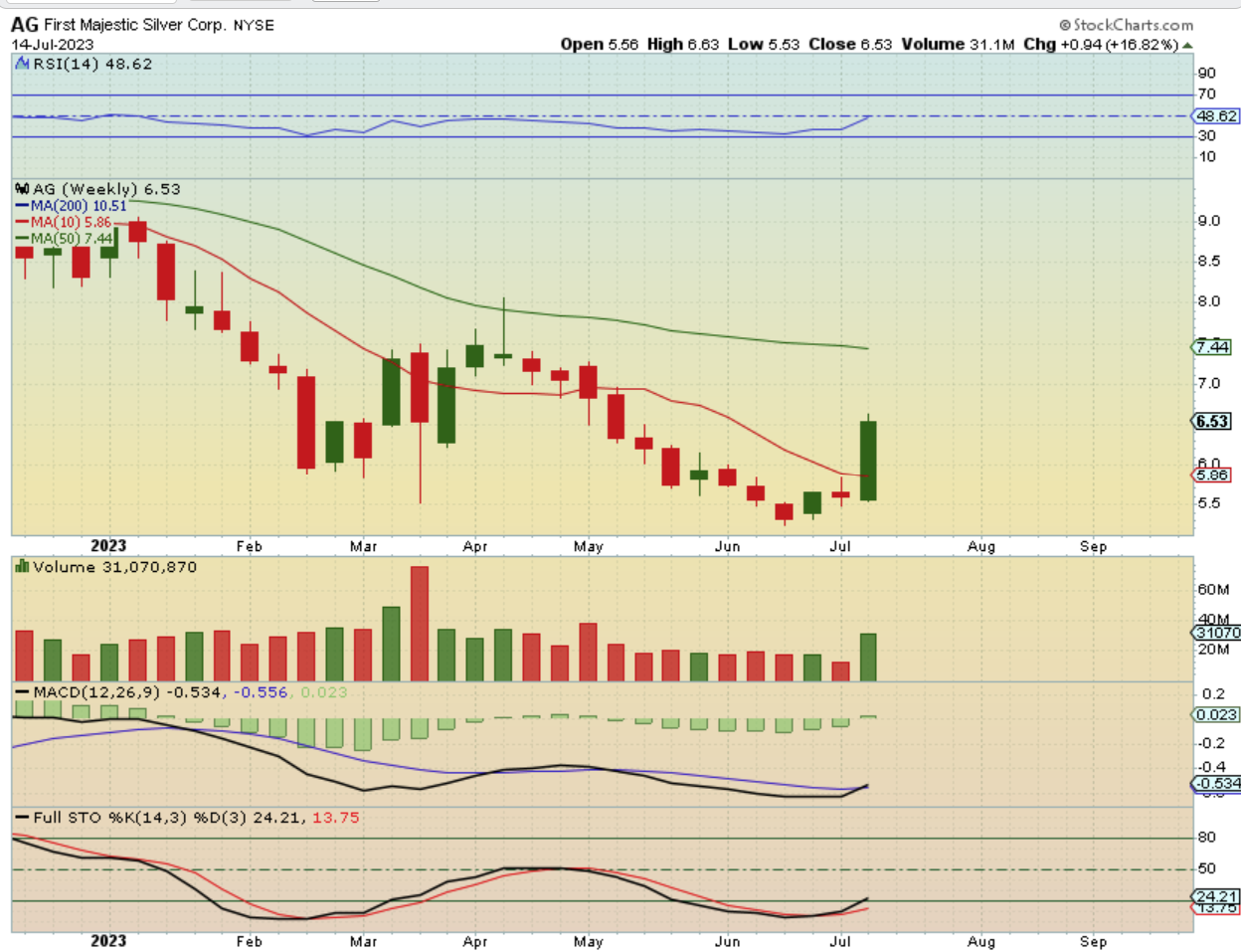 AG was up 16.82% last week and it remains oversold and the weekly MACD is just crossing higher now. Again, these are still at the lows, so this could be a very good end of the year for Miners, my friends.