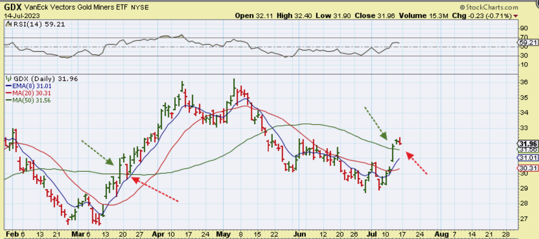 The USD failed last week and is heading lower. We did see a small reversal candle on Friday, so after the last 6 days of selling in a row, it would be normal to get a bounce. How high will it bounce? We cannot know for sure, but that should offer a buying opportunity or ‘add’ in Miners for those not fully invested, but wanting to be.