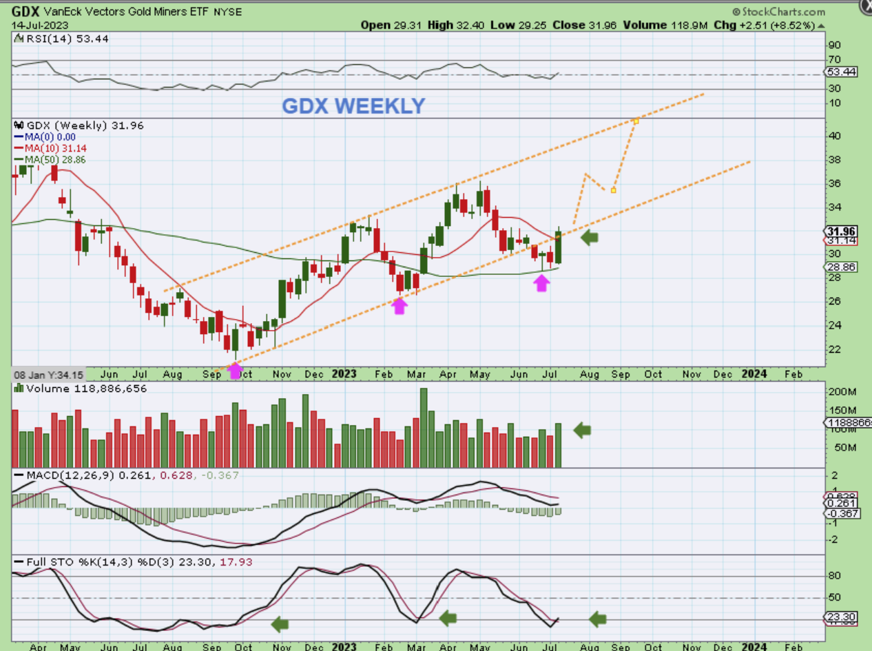 When I look at The GDX ETF Weekly Chart, it looks to me to have bottomed perfectly on the 50 week ma, and is recovering from a shake out under the lower trendline or upward sloping channel.