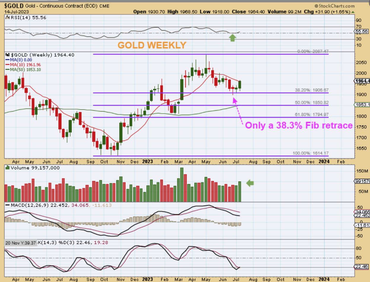 The Weekly Gold Chart landed at the 38% Fib area and reversed higher. That is a Strong set up and Gold looks to be prepared to run up and break out to all-time highs and more. This is a very bullish set up and the pullback was minimal.