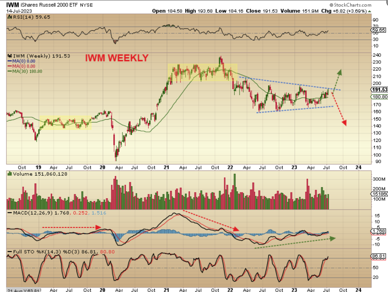 IWM WEEKLY– As mentioned, the IWM was not rallying with the NASDAQ & SPX, but it did start to push higher recently. It is inside of a triangular consolidation, so the question here is, will it top out soon(?) or will it break out and run? Many of the EV and Clean Energy stocks do look bullish.
