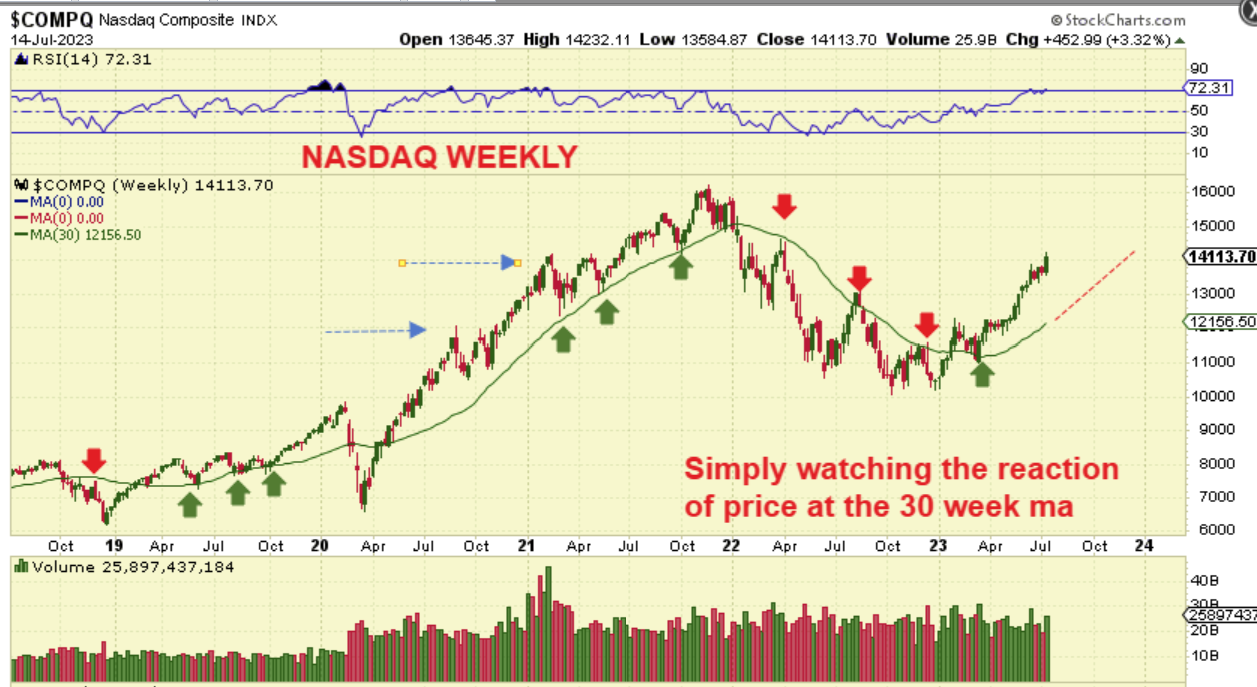 After putting in a very choppy base, You can see the strength in THE NASDAQ, as it broke free and has been pushing higher almost straight up. That being said, even with a straight up rally in 2020, we eventually saw pull backs to the green 30 week ma, so we can still get a pullback of some sort here, despite the strength.