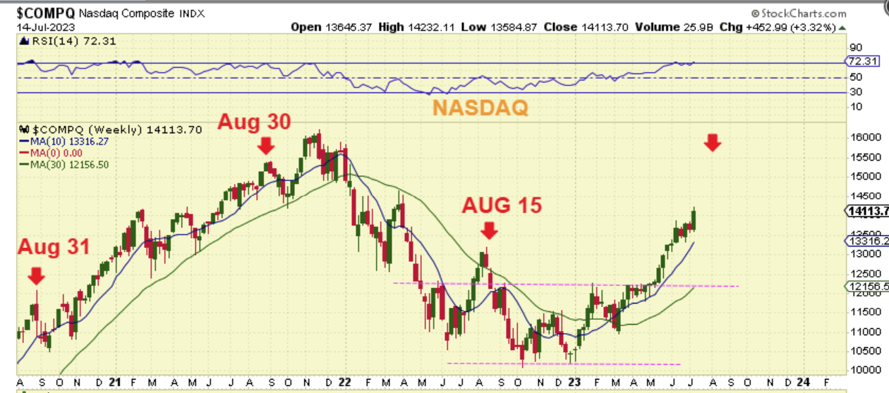 NASDAQ -It is also quite interesting when you look at ‘peaks’ before a drop into an ICL. Many times the peak came in August for the General Markets. If that happened now, that would give us 2 weeks to 6 more weeks.
