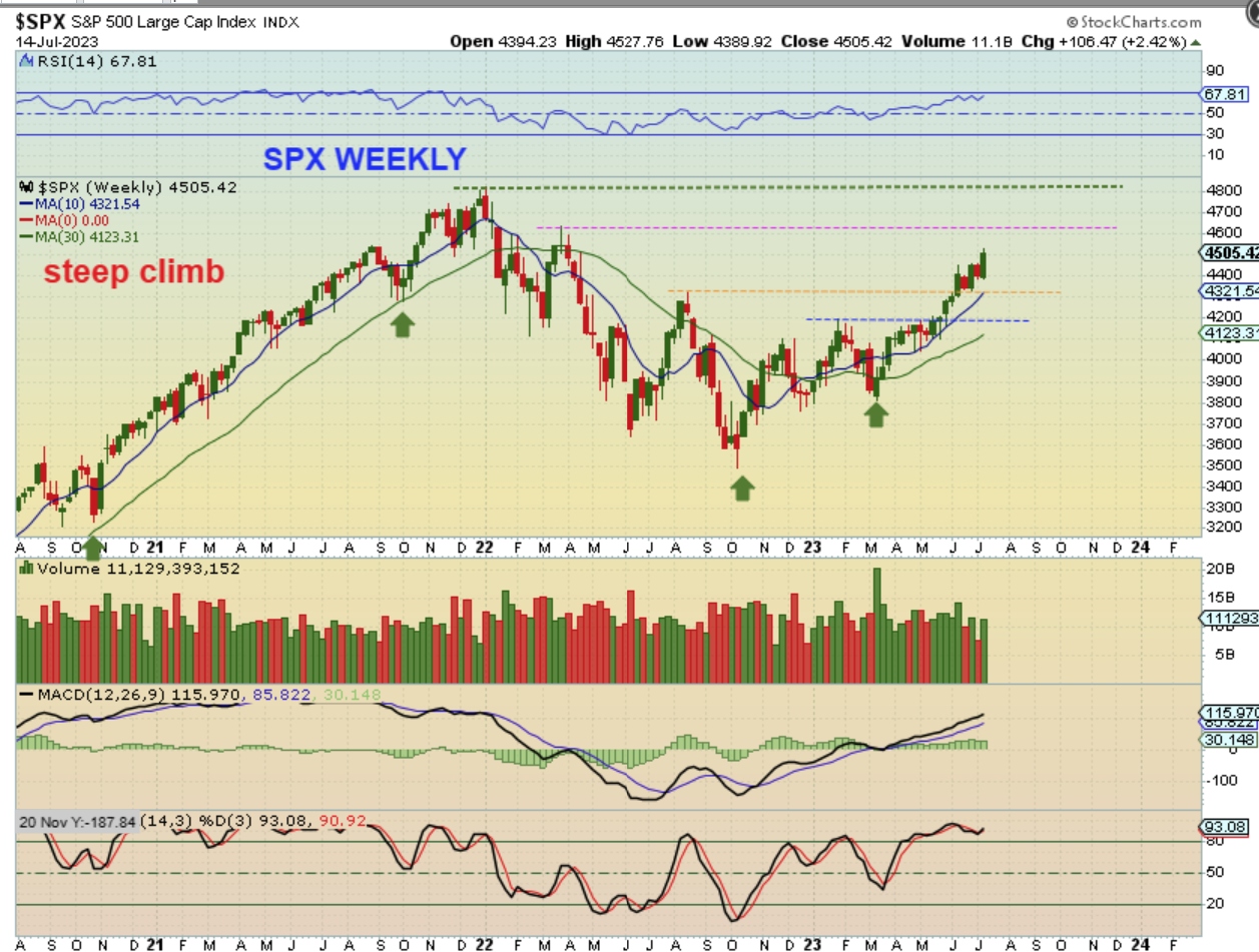 SPX WEEKLY- Take a look at just the last 5 weeks. We saw a Big week up, a fairly big drop. A Big week up, and another fairly big drop, and last week a Big week up. There is no follow through selling so far. The next upside target area would be about $4600+.
