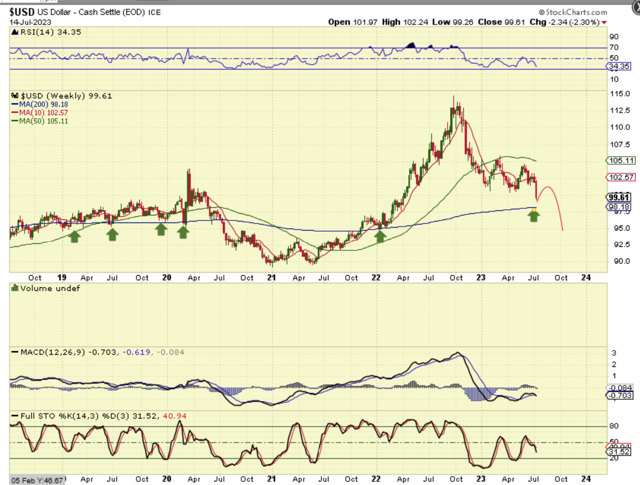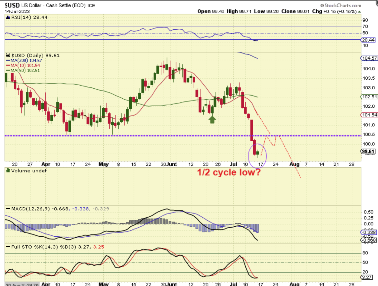 USD WEEKLY We would be bouncing from above the 200 week ma, but that has been sloppy support in the past anyway. The main point here is that we have a failed daily cycle and a failed intermediate cycle and I am expecting lower prices in the big picture as a result.