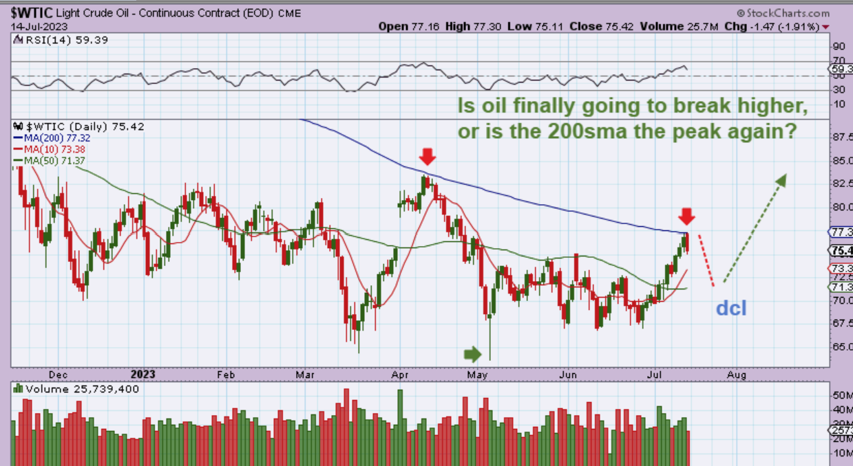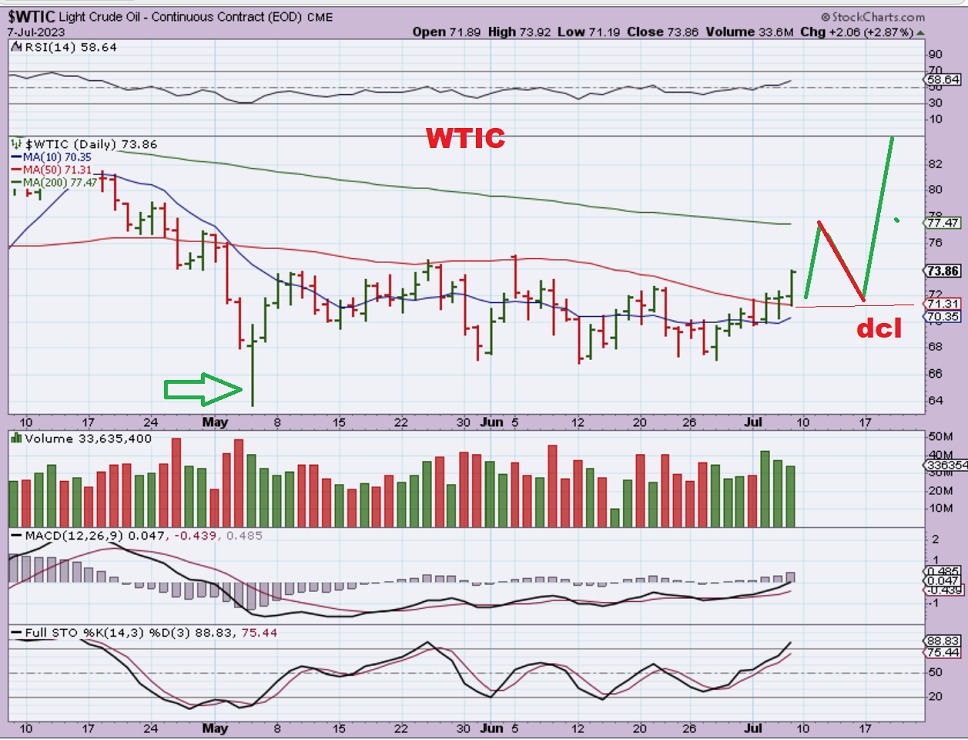 WTIC JULY 7th – Over a week ago I said that I expected Oil to run to the 200sma, likely find resistance, and drop back to form a dcl. It may then run up and break out. Since then…