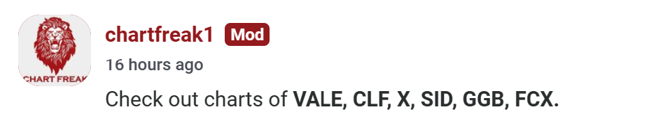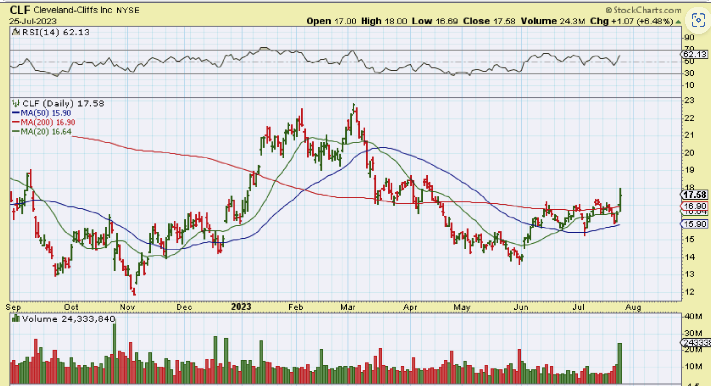 CLF popped up over 10% yesterday after posting that chart, but sold down a bit and closed up 6.48%. This sector is bullish and CLF is now above the 50sma and 200sma. This sector may also get some buying if the Markets sell down (rotation out of Tech and into Miners and Metals and maybe a few other areas).