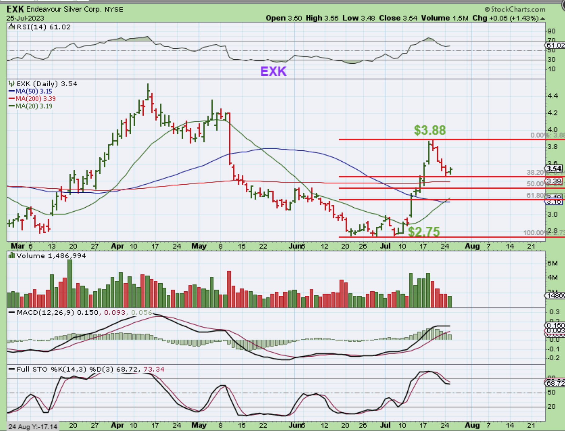 EXK had a strong run out of the lows and now it has pulled back 38.2%. Even a deeper drop to the 50sma or 50% Fib level is Bullish.