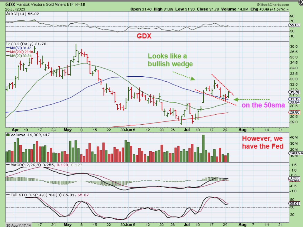 THE GDX ETF has formed a bullish wedge that dropped down to the 50sma. So far this remains very bullish.