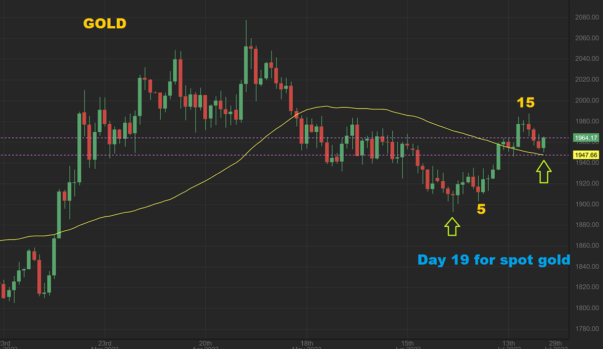 GOLD rallied above the 50sma and has a day 15 peak. It then back-tested the 50sma like any other Bull Run could, and now it has reversed the day before the Fed. On a ‘Fed day’, anything can happen short term, but this is a bullish set up on day 19 today, and it should start to make a run higher soon.