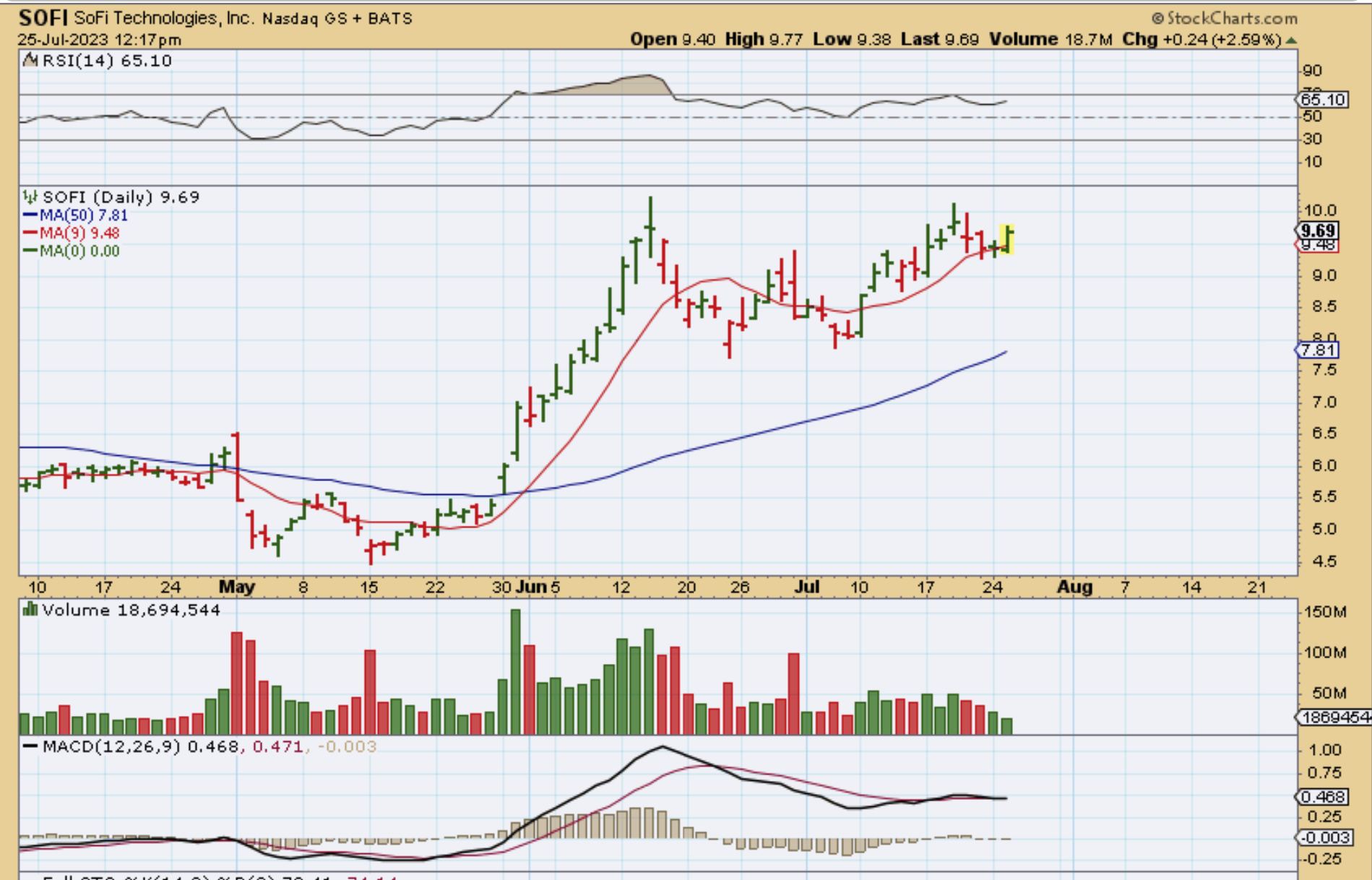 SOFI – This is a beautiful Cup & Handle after a strong run in May from $4.50 to $10. I rode some of that as a day trade, but after I sold and jumped out, it just kept on running without me. I actually missed most of that move as a result ( It was non-stop $4.50 to $10, and offered no good pull back for re-entry after $7).