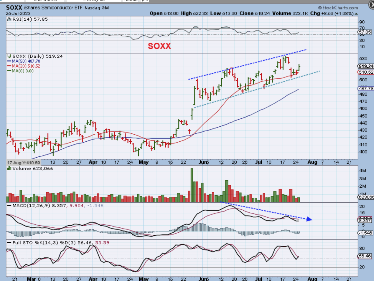 SOXX – As the Semiconductor ETF continues to chop higher, that MACD divergence is strong and should indicate gradual weakness. I am expecting a pull back and I want to short this using SOXS, but I also want to see what happens after the Fed Mtg.