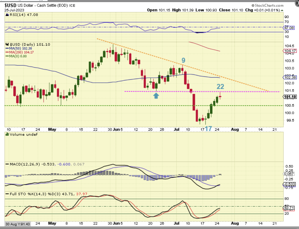 1. After a DCL at June 22 & a day 9 peak, the USD very bearishly crashed below that dcl and then it also lost the multi-month lows.