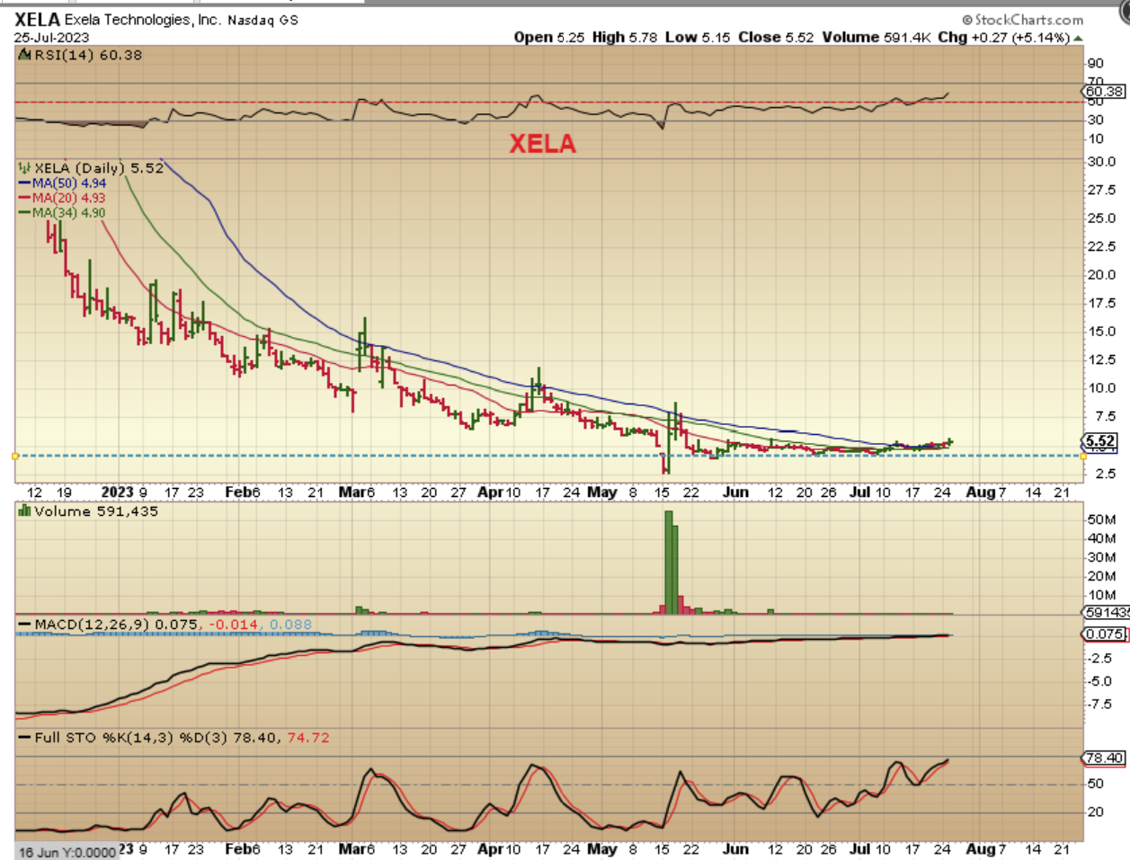 XELA had a reverse split, so the moves can be exaggerated, but let me point something out to you. In March it Popped and failed to hold above the blue 50sma. In April it Popped and failed to hold above the 50sma. In May it crashed after the split and then tried to get above the 50sma, but failed to hold. Right now it is $5.52 and the 50sma is at $4.94. The 20sma is at $4.93. The 34 sma is at $4.90. These set ups (if no bad news comes out) often start to trend higher. It can have BIG swings and be hard to hold, but it could make some nice gains over time too.