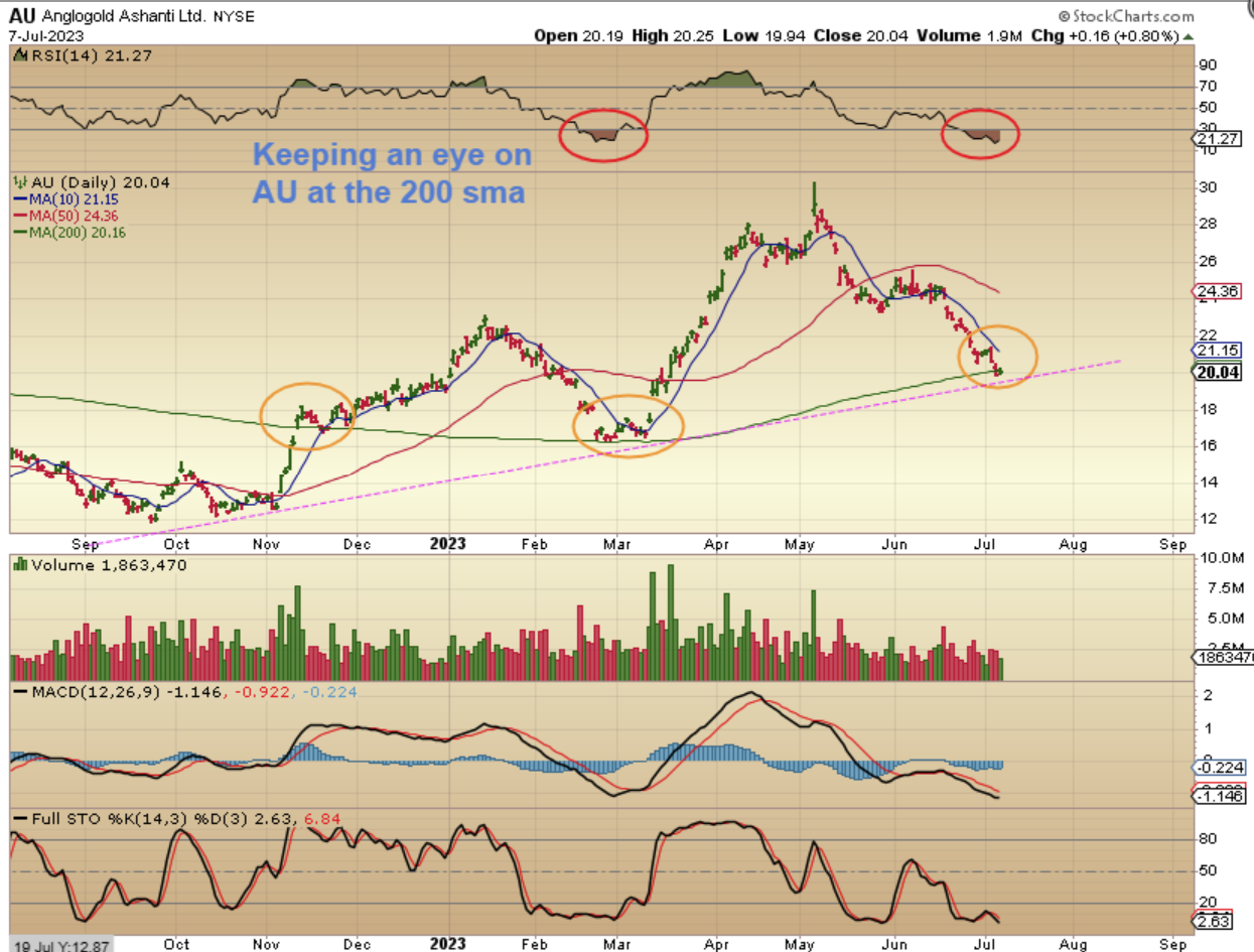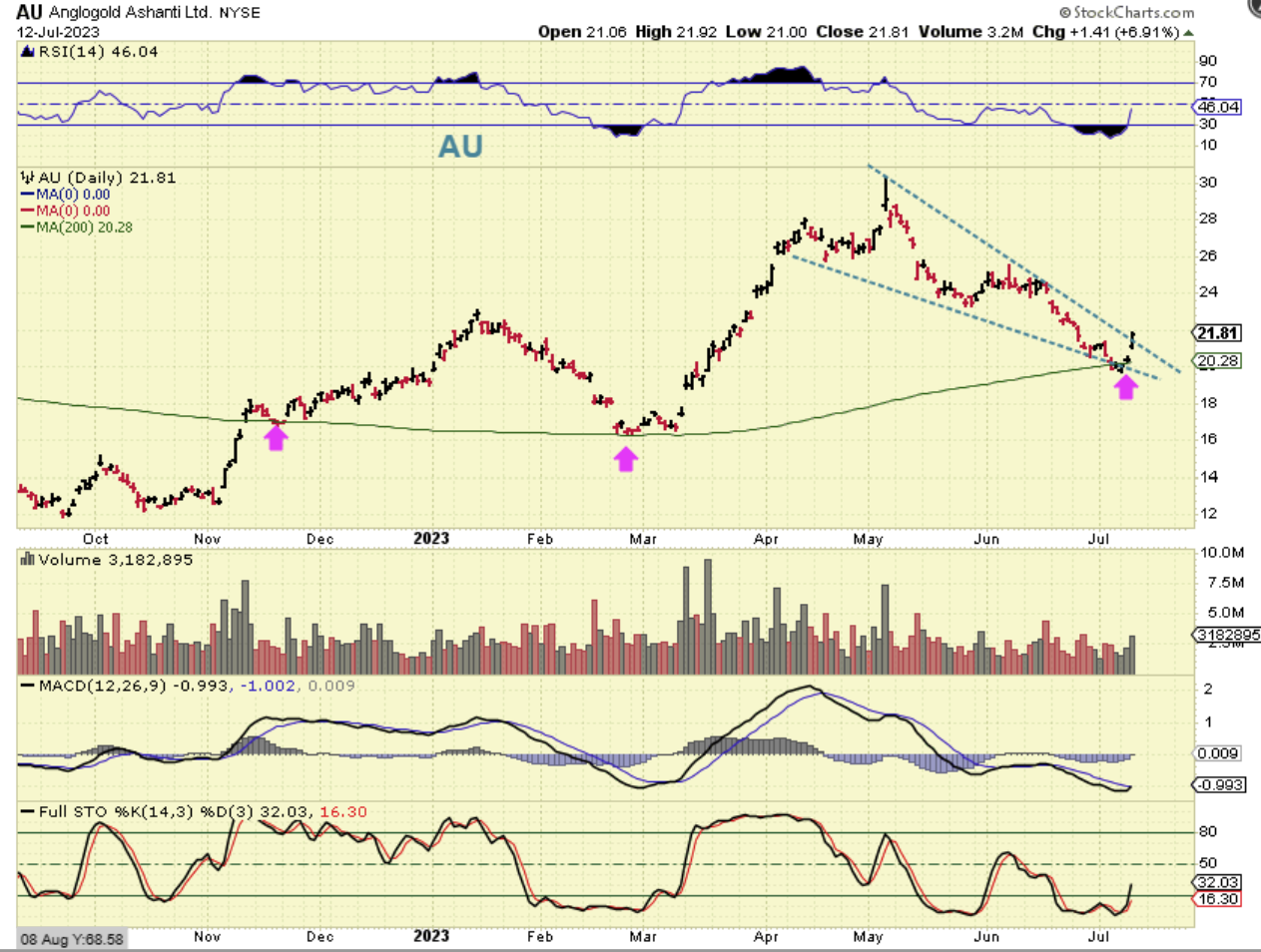 AU was in my report last week as a Miner that dropped to the green 200sma and uptrend line. Well…