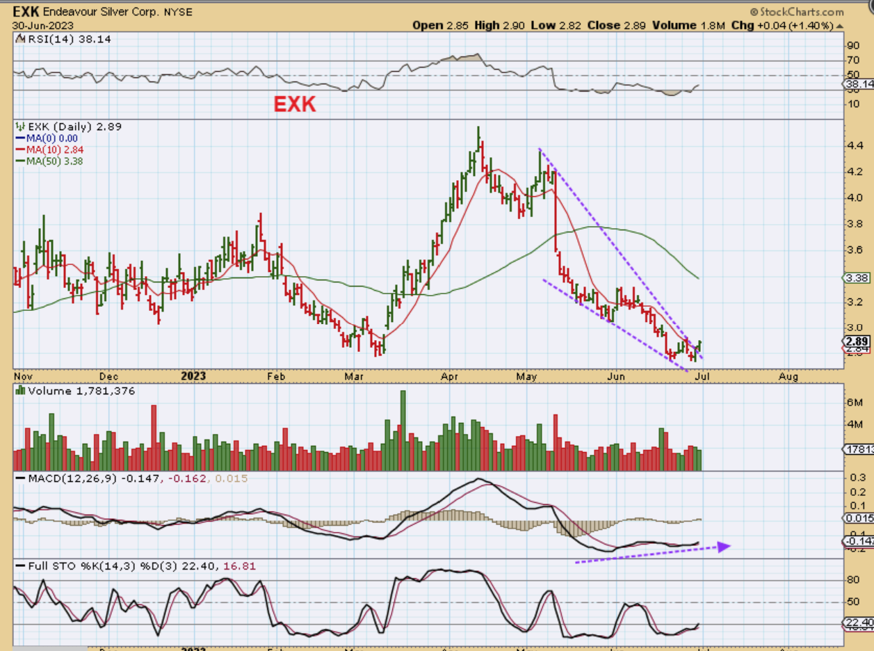 On June 29 I pointed out that many Silver stocks like EXK had strong divergence right at the lows. It also had a 5 wave drop, which often is the end of the selling, so things started to turn bullish using technical analysis in June.
