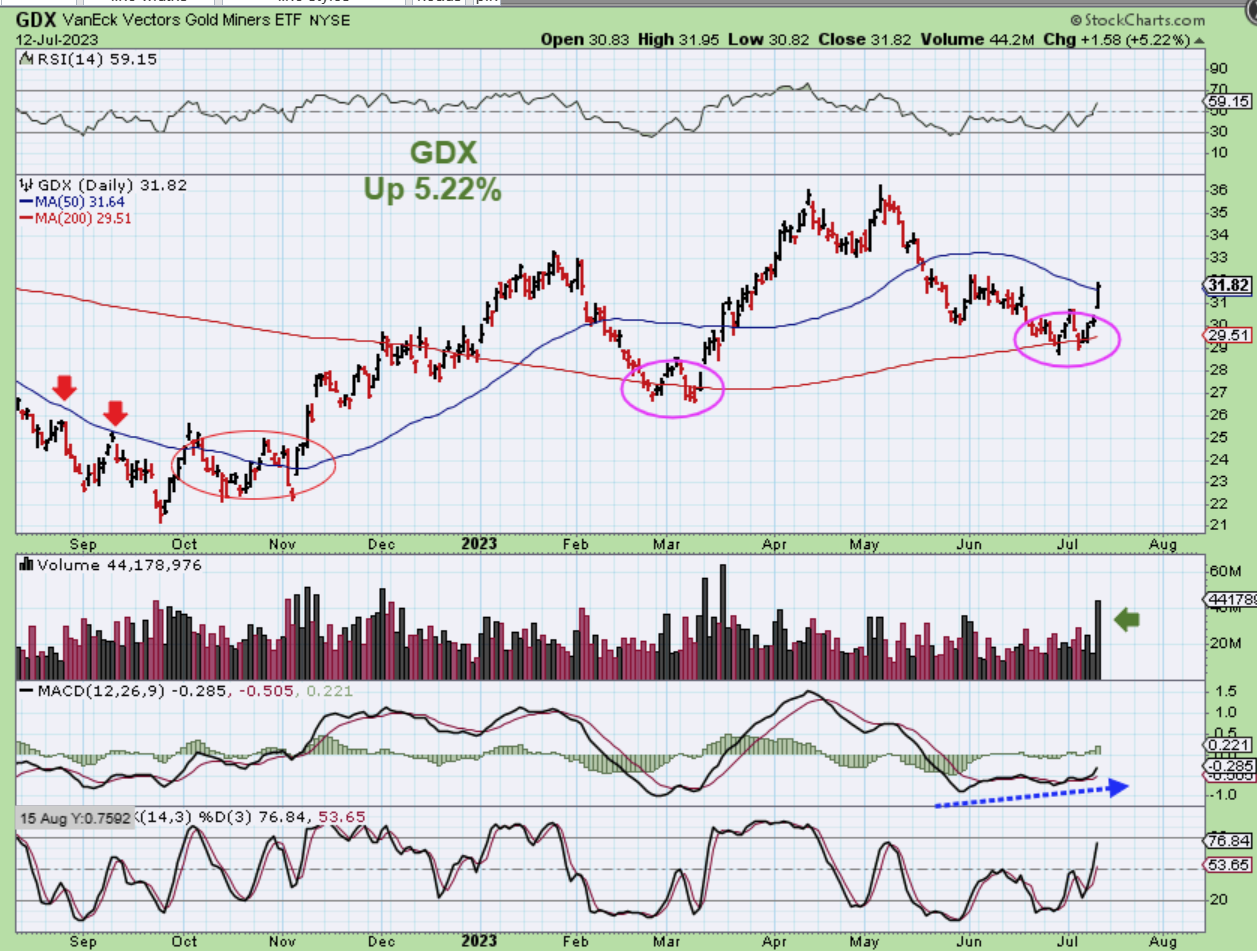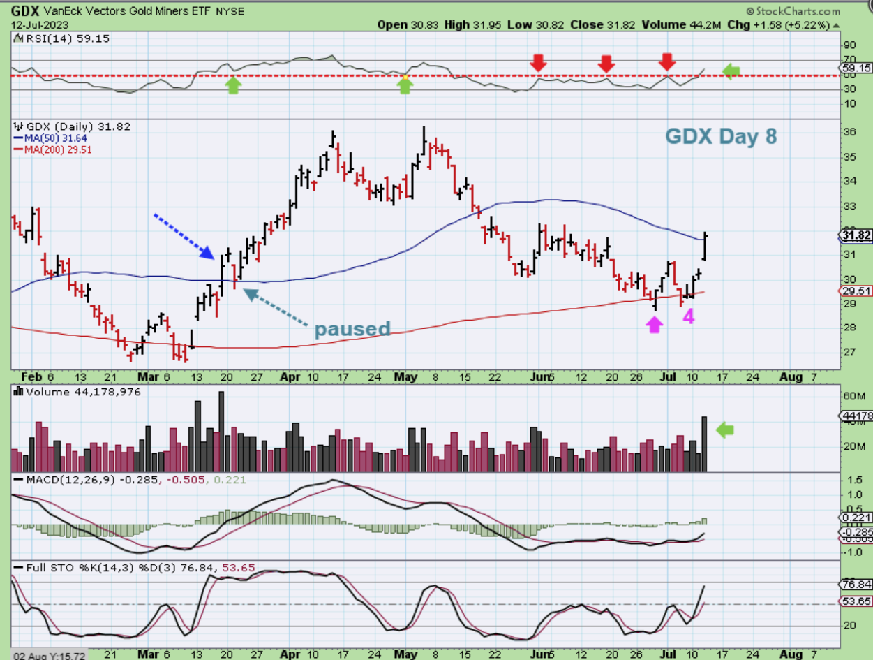 Recently I was showing the similarities on GDX Now and GDX at the March double bottom lows at the 200sma. Now with Wednesdays surge in price as well as volume, and break of the 50sma and the RSI 50, the similarities continue. So…