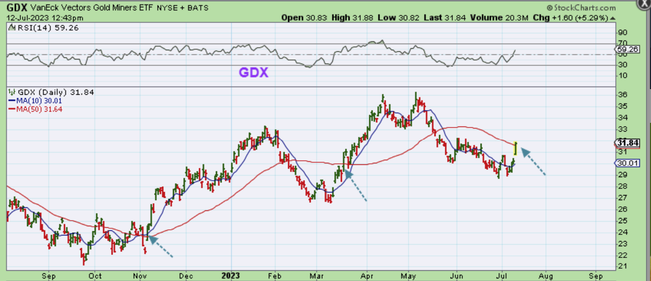 This was The GDX at midday Wednesday. Why am I am pointing to our last 2 ICLs where GDX broke above the 50sma?