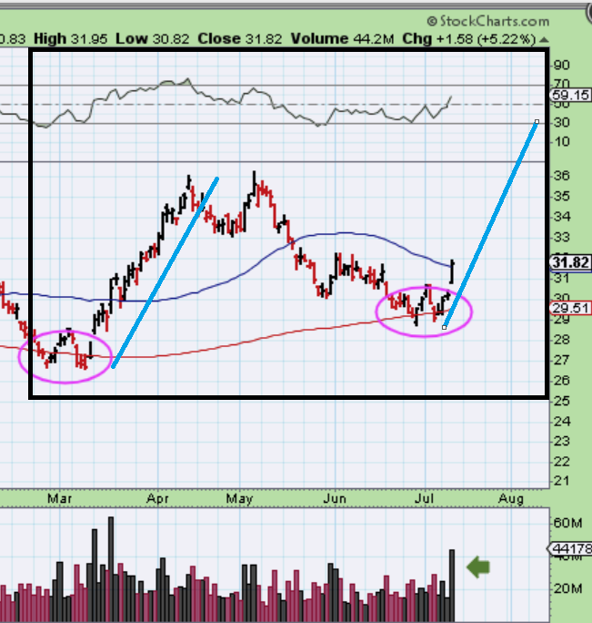 AU stayed at the 200sma until yesterday when it gapped up and gained 7%. I’d expect another solid run from AU now that we are moving higher again. Did you notice that when AU Gapped higher in both the November and March rallies, those gaps did not fill? So that may indicate that this one may not either.