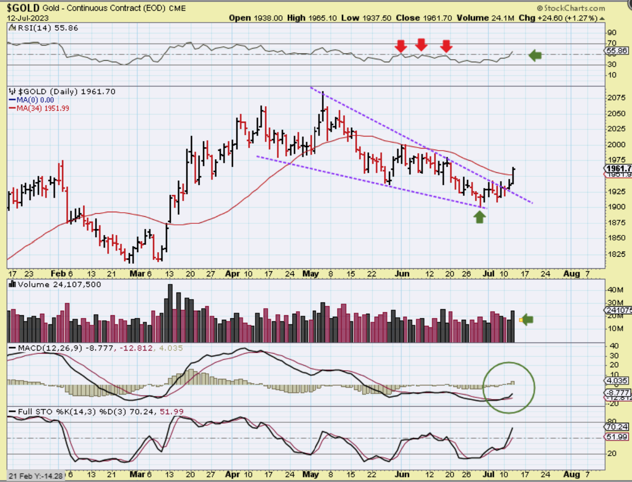 GOLD – Notice the RSI was unable to gain 50% in June, but it is doing that now. The MACD is crossing up too, so these are signs of Bullishness that also add to the confidence that things are shaping up and Golds weakness (correction / consolidation) is ending.