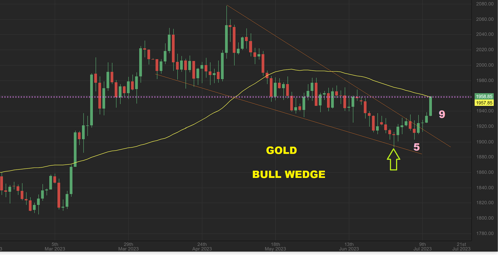 GOLD surged after breaking from that Bull Wedge with the USD drop. This is only day 9 for Spot Gold, and this could make its way back to the all-time highs very quickly if that USD just rolls over.