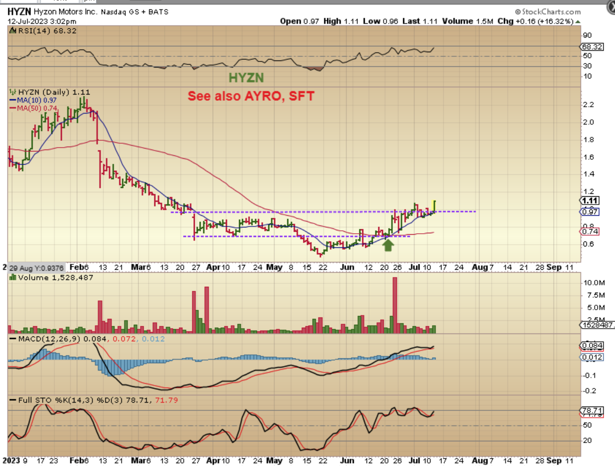 HYZN, AYRO, and SFT ( Auto and EV Auto) pushed higher and started to break from their bases yesterday. Here you see HYZN up 16% , so I just wanted to point out this sector again as progressive and bullish.
