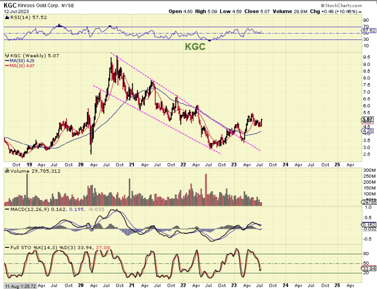 The Big Picture Weekly chart for KGC shows a down trending channel with a breakout, a back test and the beginning of a recovery.