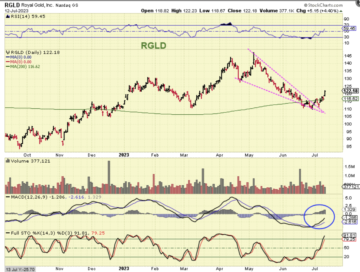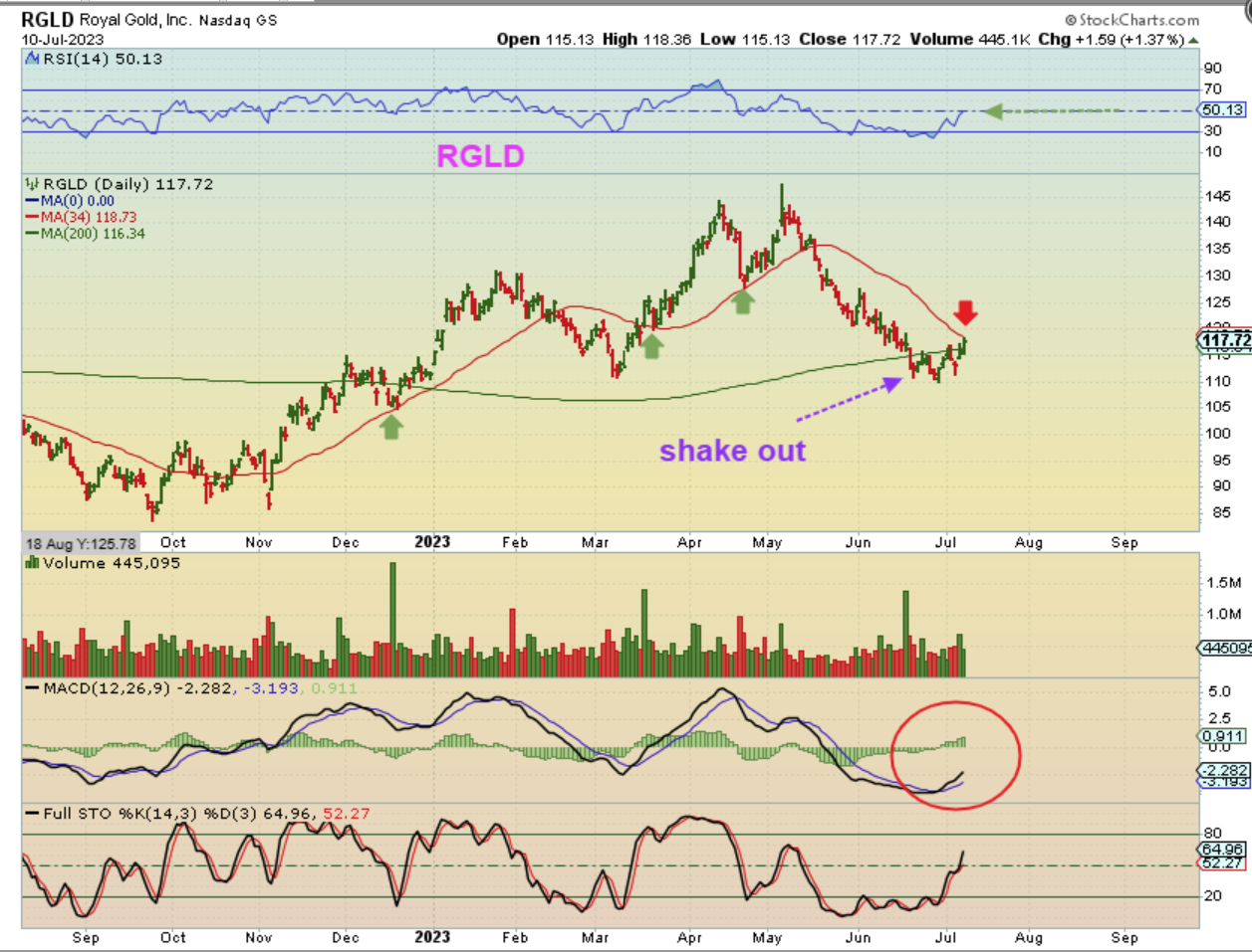 RGLD was also pointed out last week as a Miner (Royalty co.) that may have done a shake out at the 200sma. That is always a buy with a stop if there are other bullish signs involved. The MACD had already crossed up and the RSI was at 50.13.