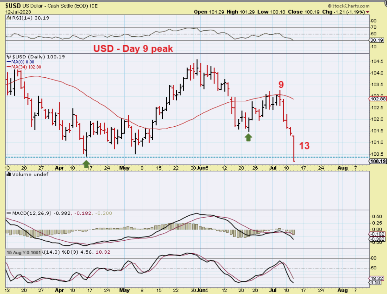 With The USD on day 13 and having only a day 9 peak, The USD has weeks to show further weakness before a dcl comes due.