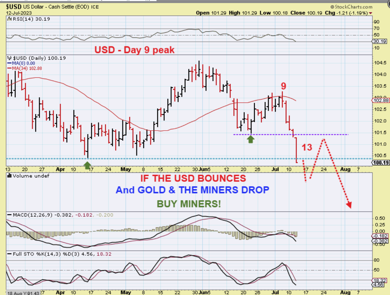 The USD Failed on Tuesday. This means that the USD should be in a failing or weak stage for the next couple of weeks (then a dcl bounce and then I expect even more downside). This would be confirming that Miners were a buy.
