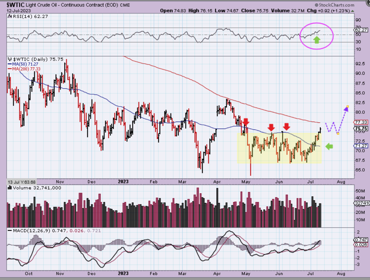 WTIC – After a very choppy number of months, Oil became trapped under the 50sma in May – July. Oil was finally able to break out last week and I expect a rally to the 200sma and then maybe a pause with a dcl.