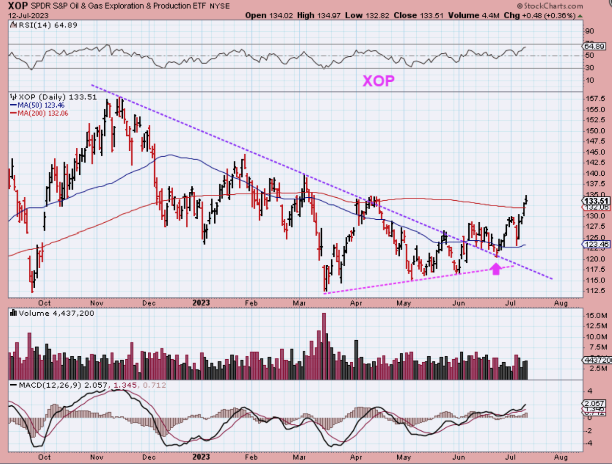XOP – So Oil Stocks became bullish and a buy recently. The XOP was actually able to push above the 200sma, so it may eventually form a dcl a from as a back test of that 200sma. We discussed XOP or GUSH as one way to trade it, or NOG, APA, VET, WTI, ERF, MRO, VLO, and a number of other Oil Stocks that could be bought and held with a stop. Charts of VET, ERF, APA, etc were in Tuesdays report.