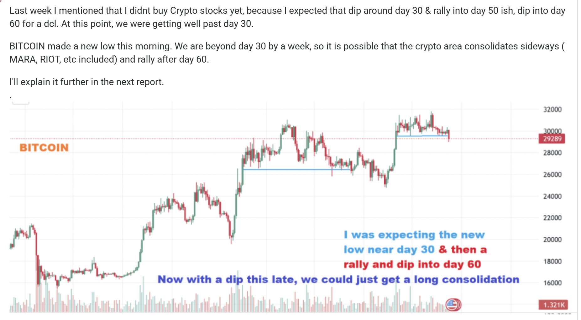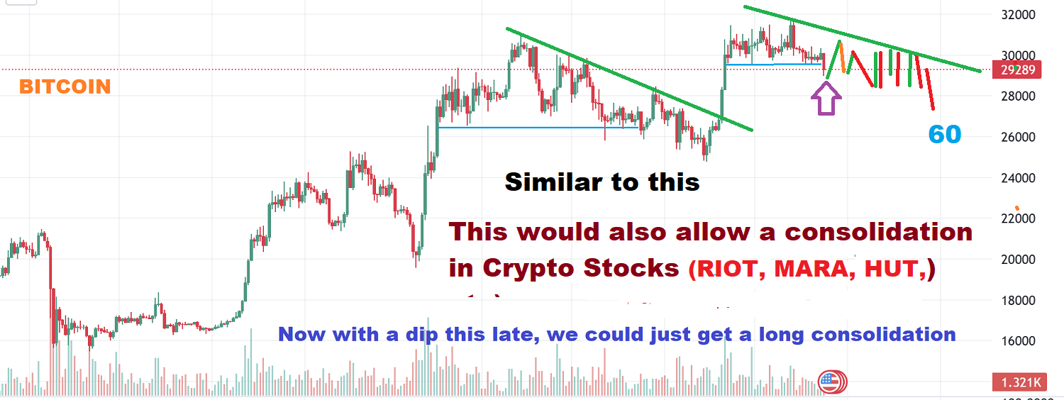 BITCOIN – Here I have just drawn a similar downward sloping correction or consolidation as the one we recently had. If we were to spend the entire 6o days drifting lower like this, it would allow the Crypto stocks time to lose their overheated / overbought conditions. This would actually need to bottom a bit before day 60 to become R.T. if it happens.