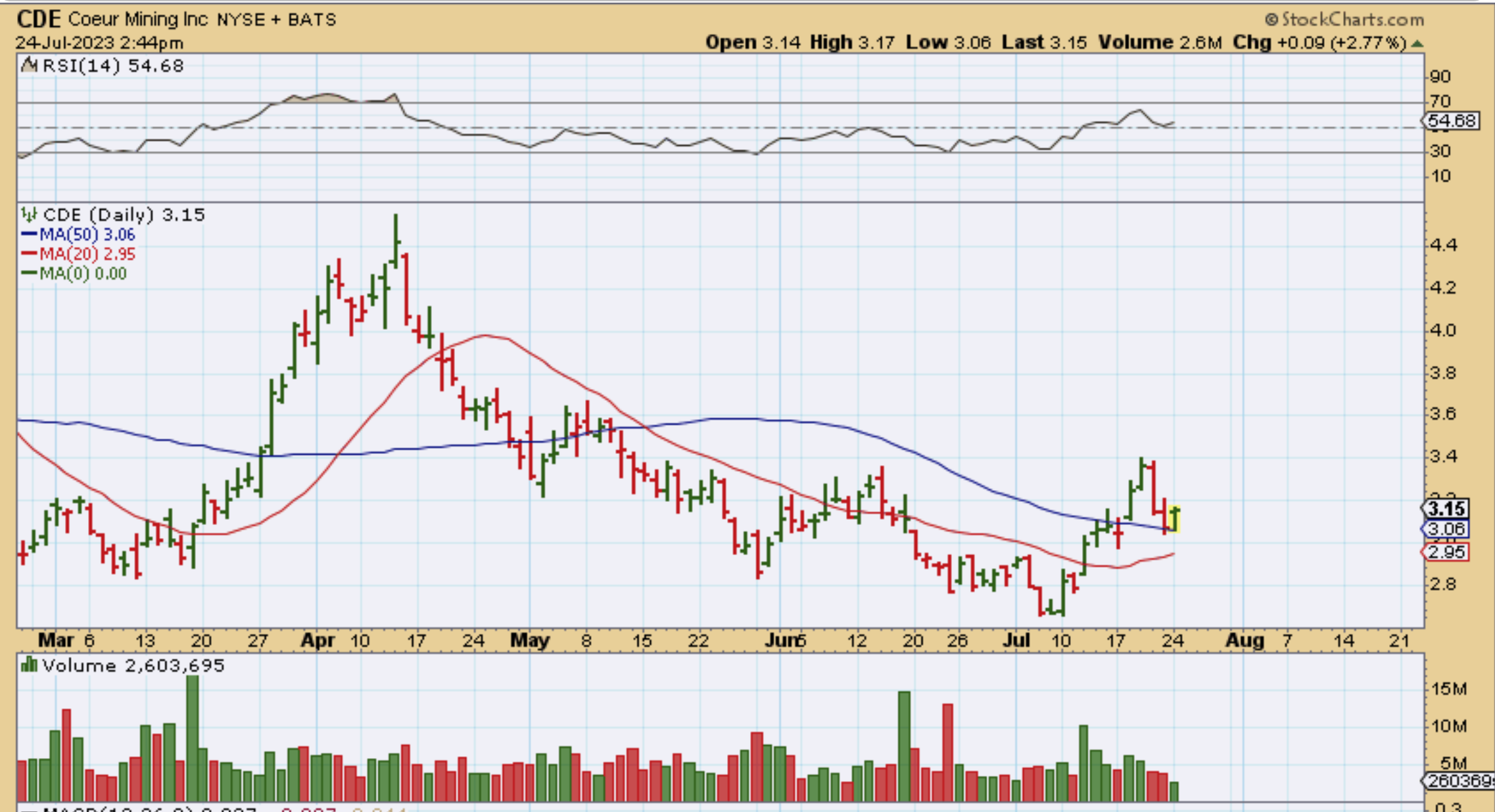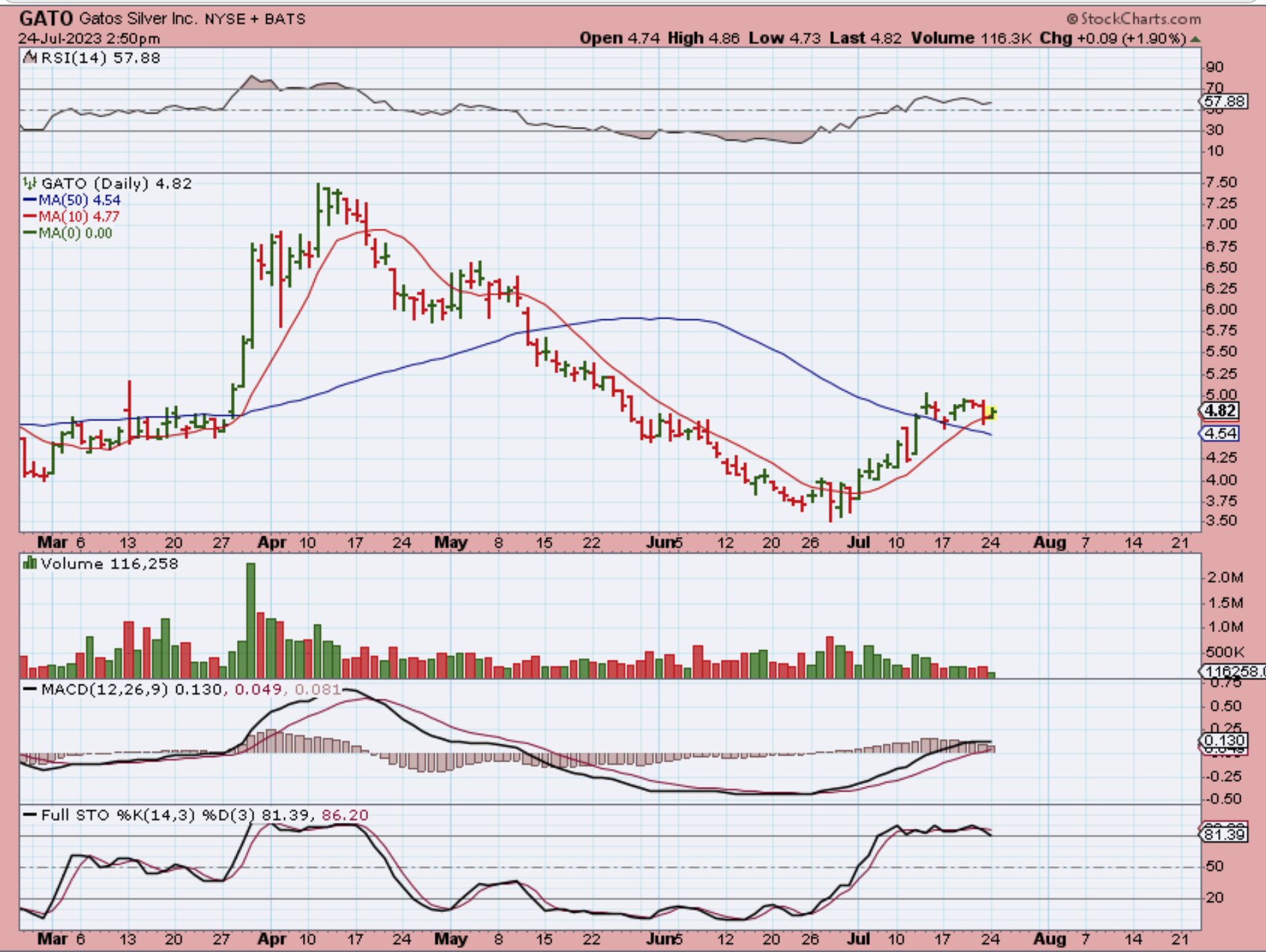 GATO is pretty much just chopping sideways. In fact, with that 5 day rally in the USD, GATO is still pennies from the recent July highs.  Yes, there is a possibility that GATO drops to the 50sma on Fed Wednesday, but it is also possible that the above Miners ( AG, EXK, CDE, and others) could just start chopping sideways above the 50sma like this also. GATO is near the July highs with Gold and Silver dropping.