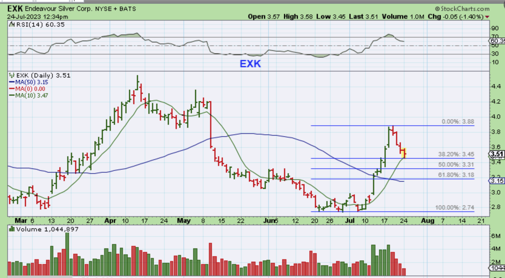 EXK has had more of a steady dip lower, but this is still very bullish. EXK ran straight up out of the lows and now it has landed on the 10sma and 38.2% Fib level. It CAN fall lower, but these are showing strength.