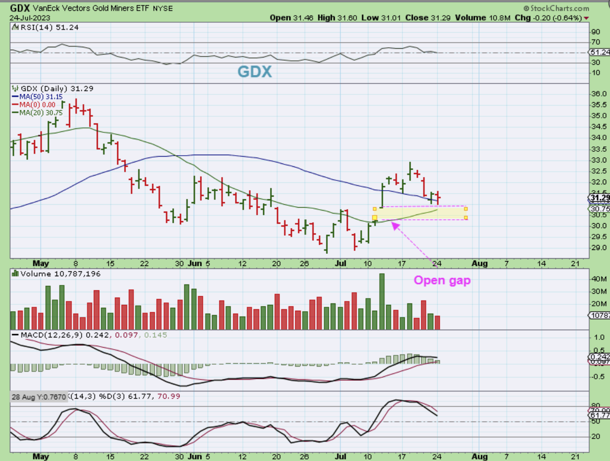 GDX is holding up well at the 50sma so far, and this dip is during a USD rally. The question is, do we fill the gap or not?