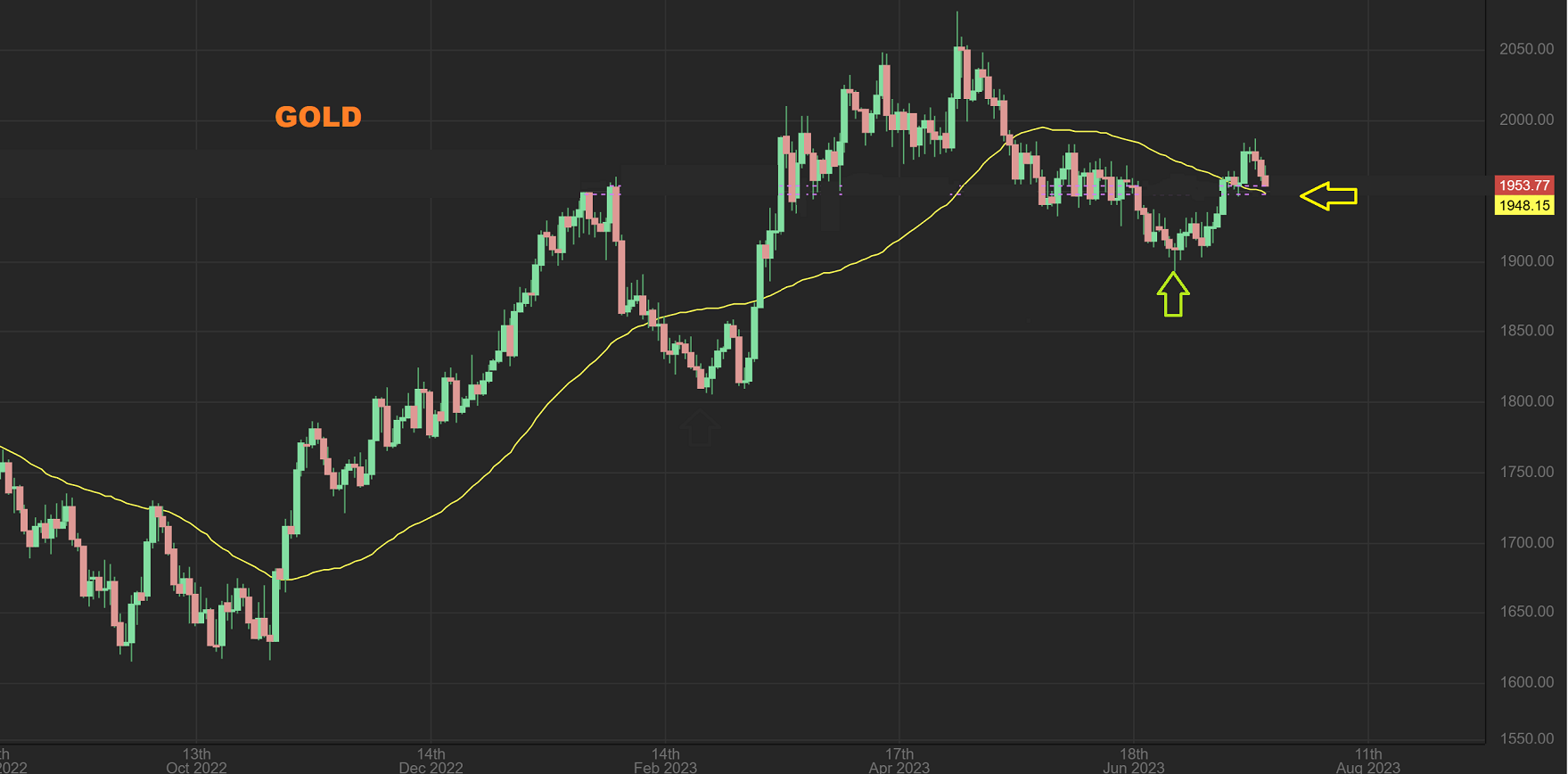 GOLD pulled back to the 50sma area on Spot Gold. Compare the rally from the green arrow to the dip. This is a nice controlled dip so far, a back test of the 50sma area.