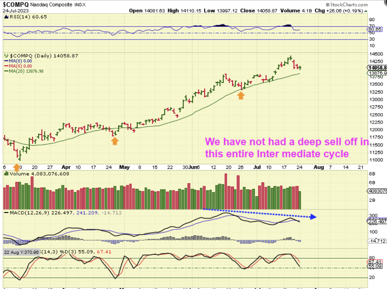 When I look at the entire Intermediate Cycle from March to now, I really do not see a deep dip. This has been a strong steady run. Even the dips into the dcl’s are at or around the 20sma. The NASDAQ peaked on day 16 so far and if that peak remains after the Fed Decision, then this could drop for a couple of weeks into day 30-40 plus, since daily cycles have been running long. That would make this a L.T. Daily.  If it drops for a couple of weeks, it should be a fairly decent drop, because we are due for an ICL in August or September.
