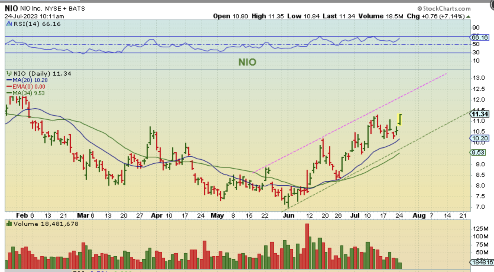 We’ve been viewing NIO as bullish and as a buy.  It broke the downtrend in June and back tested the 50sma. We have seen JOBY, TSLA, XPEV, HYZN, AYRO,  and NKLA take off & run higher too. NIO then began to form a channel higher and I posted this chart for July 19 as it back tested the 200sma.