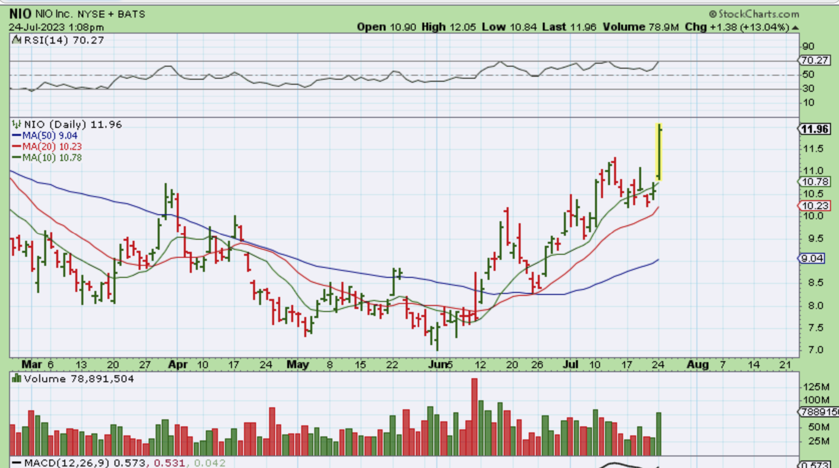By midday NIO  was now up 13% with strong volume for just 1/2 a day, so this sector continues to move higher. I will say that it has been a choppy move for many of these and that makes it a little tough to hold unless you buy at a low spot near support.