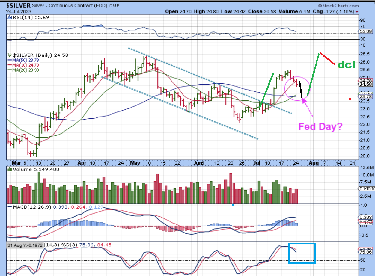 SILVER can rally fast in just 5 days, so with Wed as day 22, it could rally to the highs and dip into a dcl. This is just an idea of how the bullish pullback and cycle timing could play out.  Let’s see what happens Wednesday first!