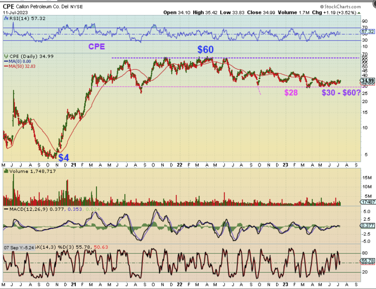 CPE (Log chart) – Take CPE for example. It ran from $4 to $60 back in 2020-2021. Then it sold off roughly 1/2 of that to the current $30 area. If Oil starts to move higher, couldn’t this now easily run to $60 or $90? I think so.