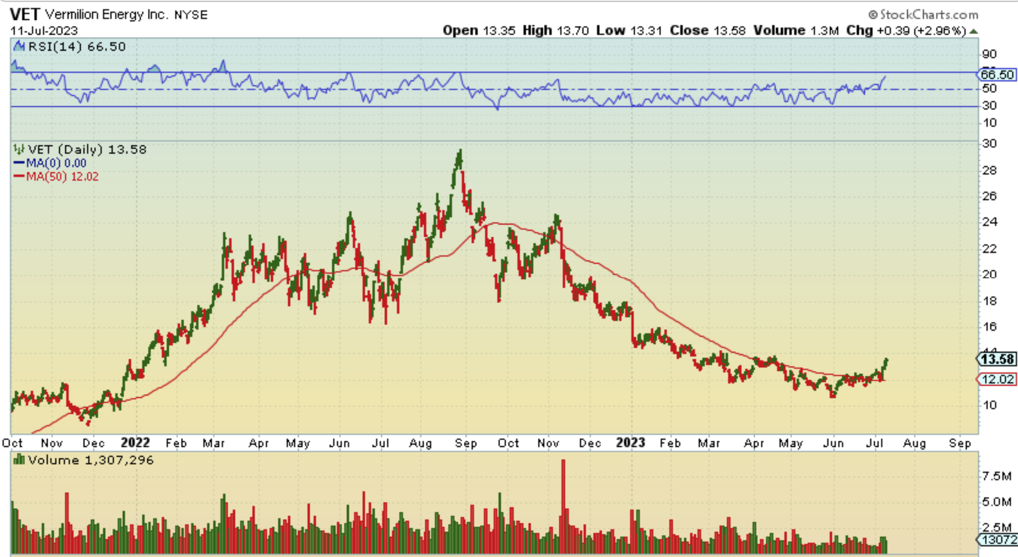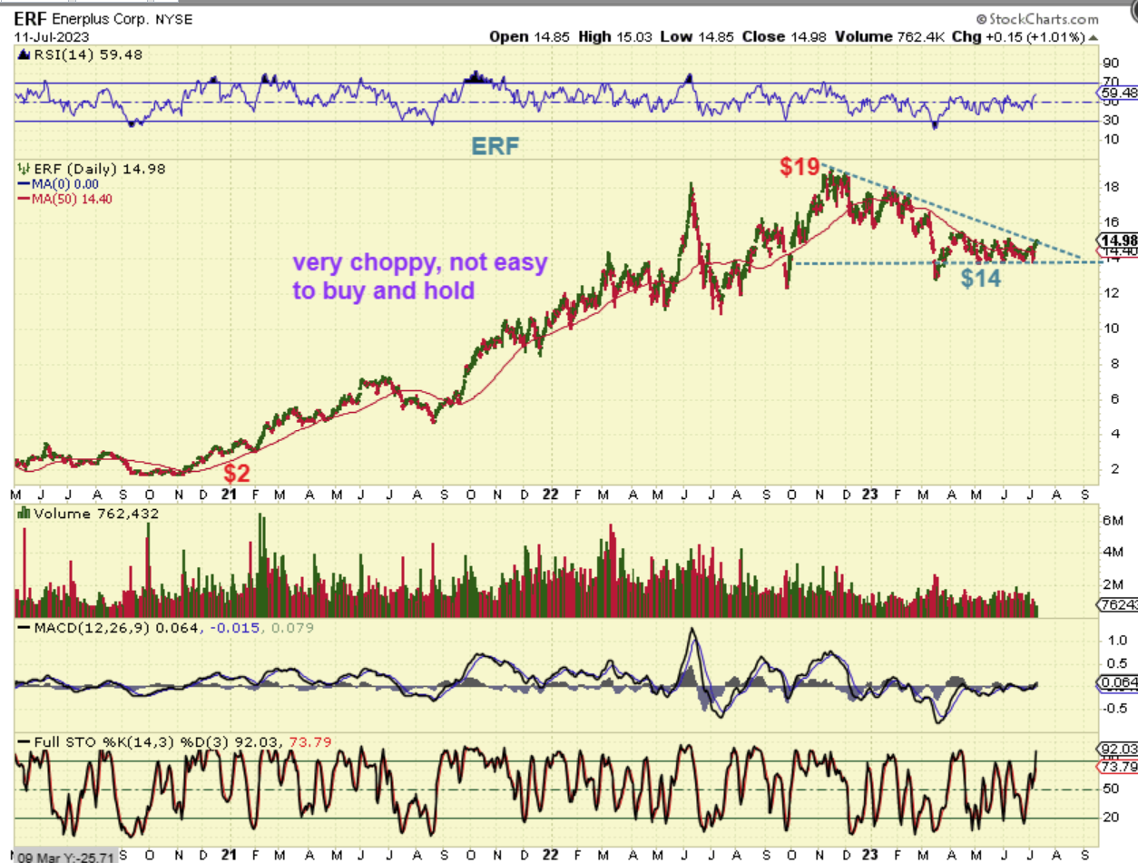 VET ran from $2 (not shown on this chart) to almost $30 and then fell back down in the $11 area with Oils sell off. This has strong upside potential if Oil continues higher and if the company stays healthy. $10 to $20 or $30? It would be possible longer term.