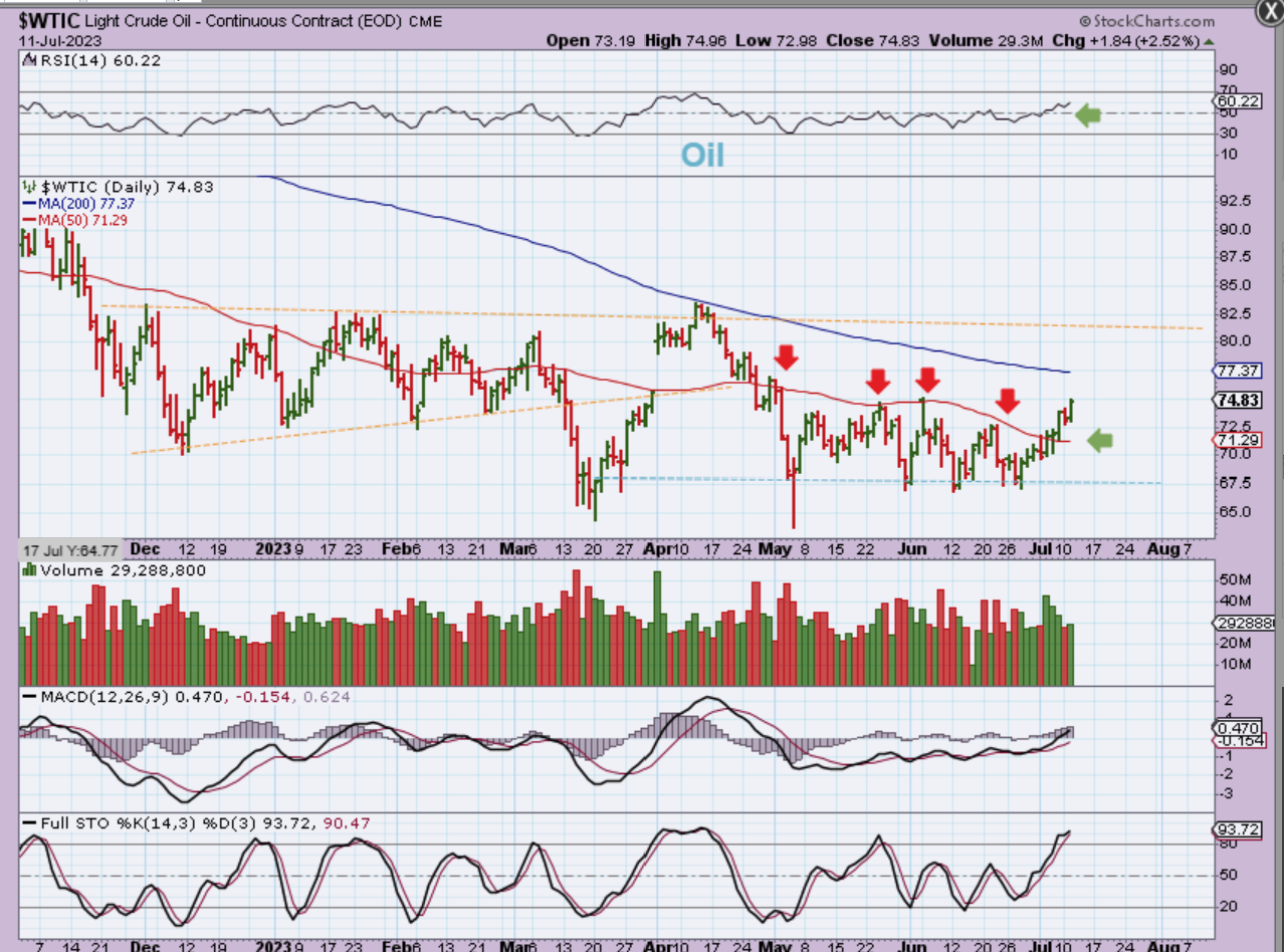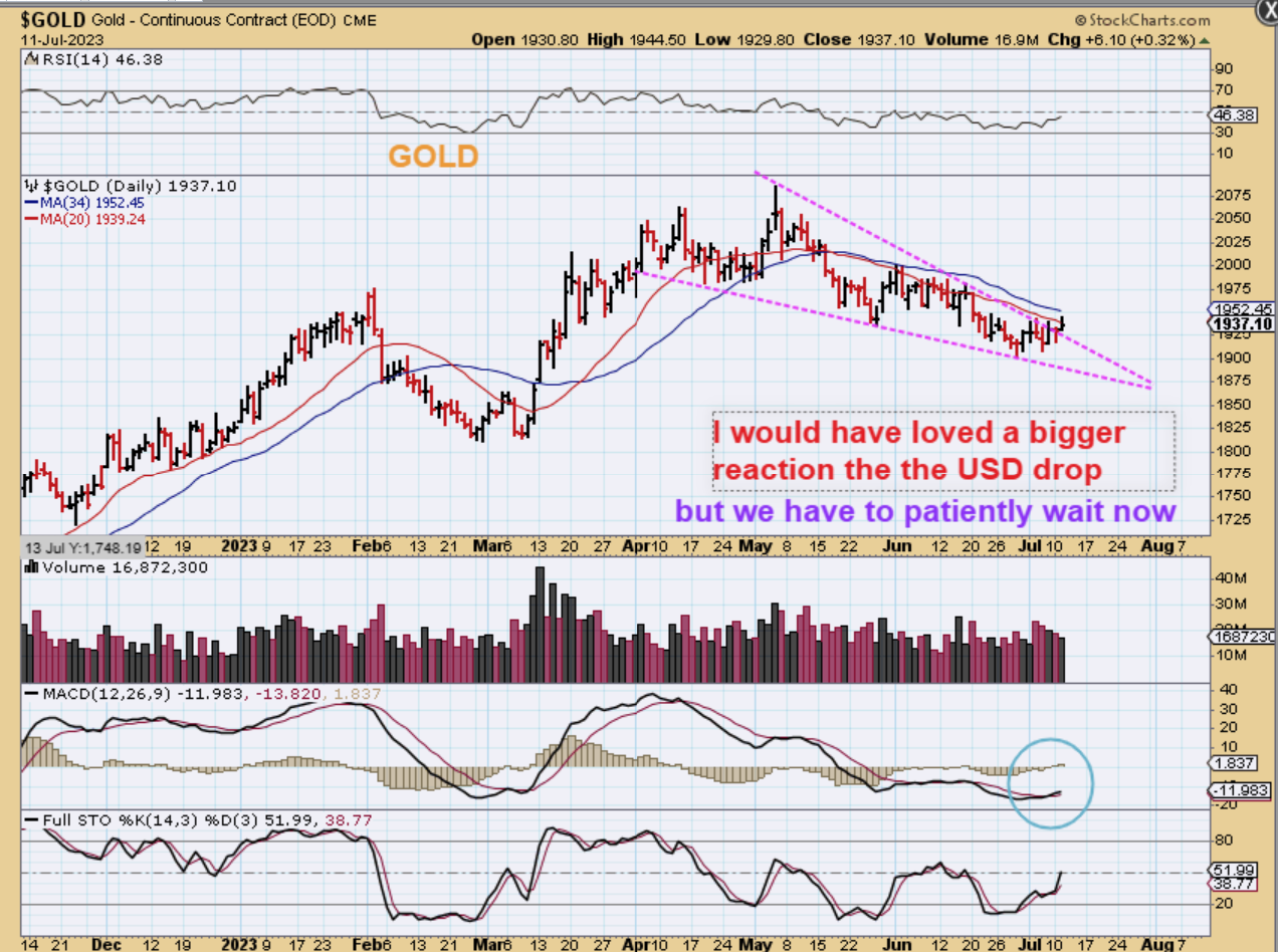 So one noteworthy development that we are seeing is that the Oil stocks have perked up and the XOP broke above the 200sma. When you look at their charts, you see that most of them have been very beaten down with Oils choppiness at the end of 2022 and over the entire 2023 year. They have been choppy and too difficult to trade. The big picture that shows the beat down actually shows that they have a lot of upside potential if Oil continues to push higher and starts to run. We have also seen some nice moves in Tech and Biotech that started earlier in the year and some recovered to their highs. Nex EV and Clean Energy stocks have been popped & some started to run. See XPEV, NKLA, CBAT, for example and PLUG, BLNK, CLNE, FSR, SOLO, WKHS, etc look as though they will start leaving bases behind now too. Crypto has been absolutely on fire again. That will become a buy the dip sector when it consolidates again too. So we have active markets for trading, but the big question for this week is still , “What will Gold do now that the USD failed? Is it time for Gold to prepare for a breakout to all-time highs?” For that answer, we have to remain patient and see how things continue to play out. Starting a few positions in Miners and adding later could be the best plan, just in case they continue to slowly creep higher day after day, but please use stops in case they break down.